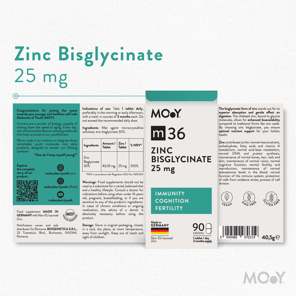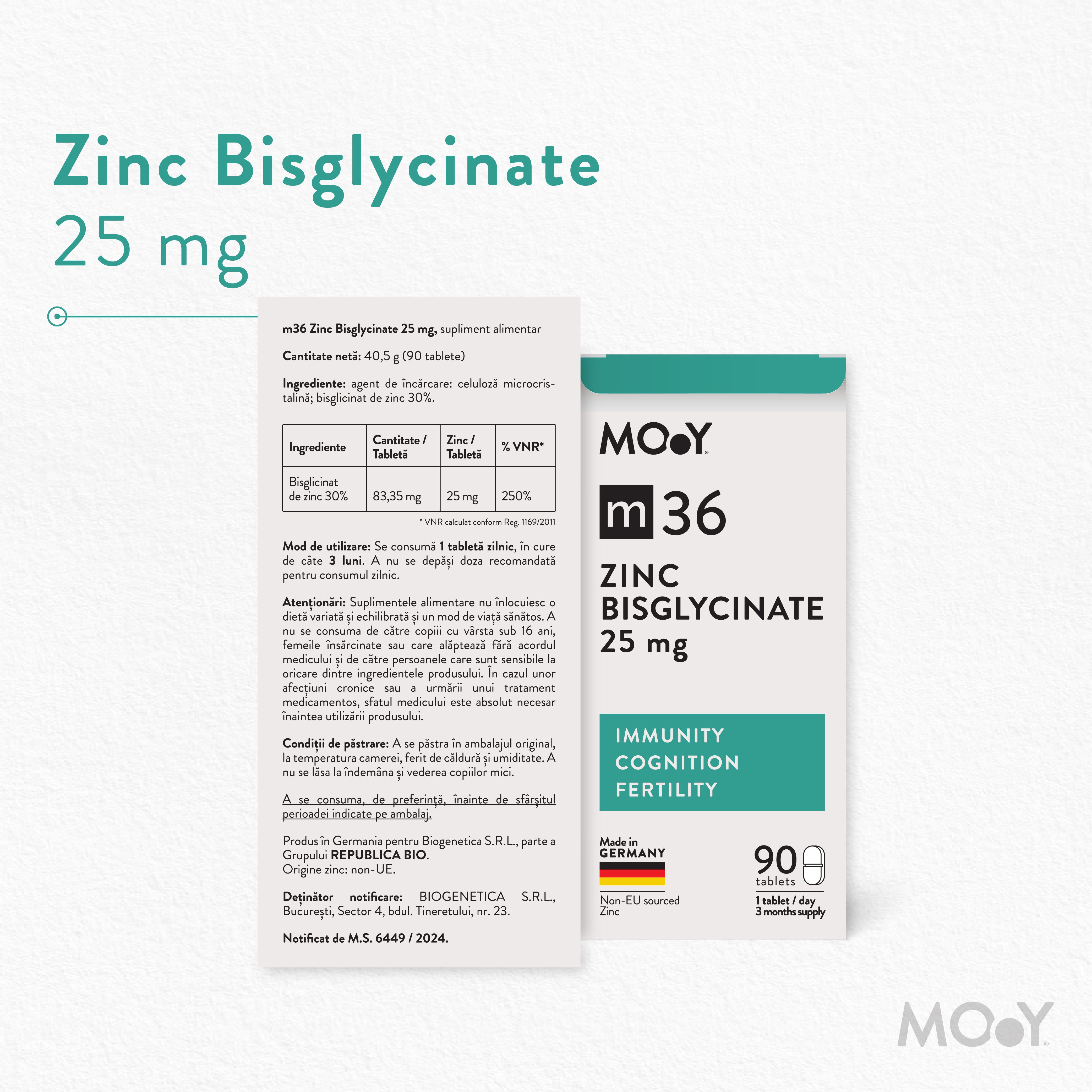 o Bisglicinat de zinc (30%) – 25 mg (250% VNR, calculat conform Reg. 1169/2011)