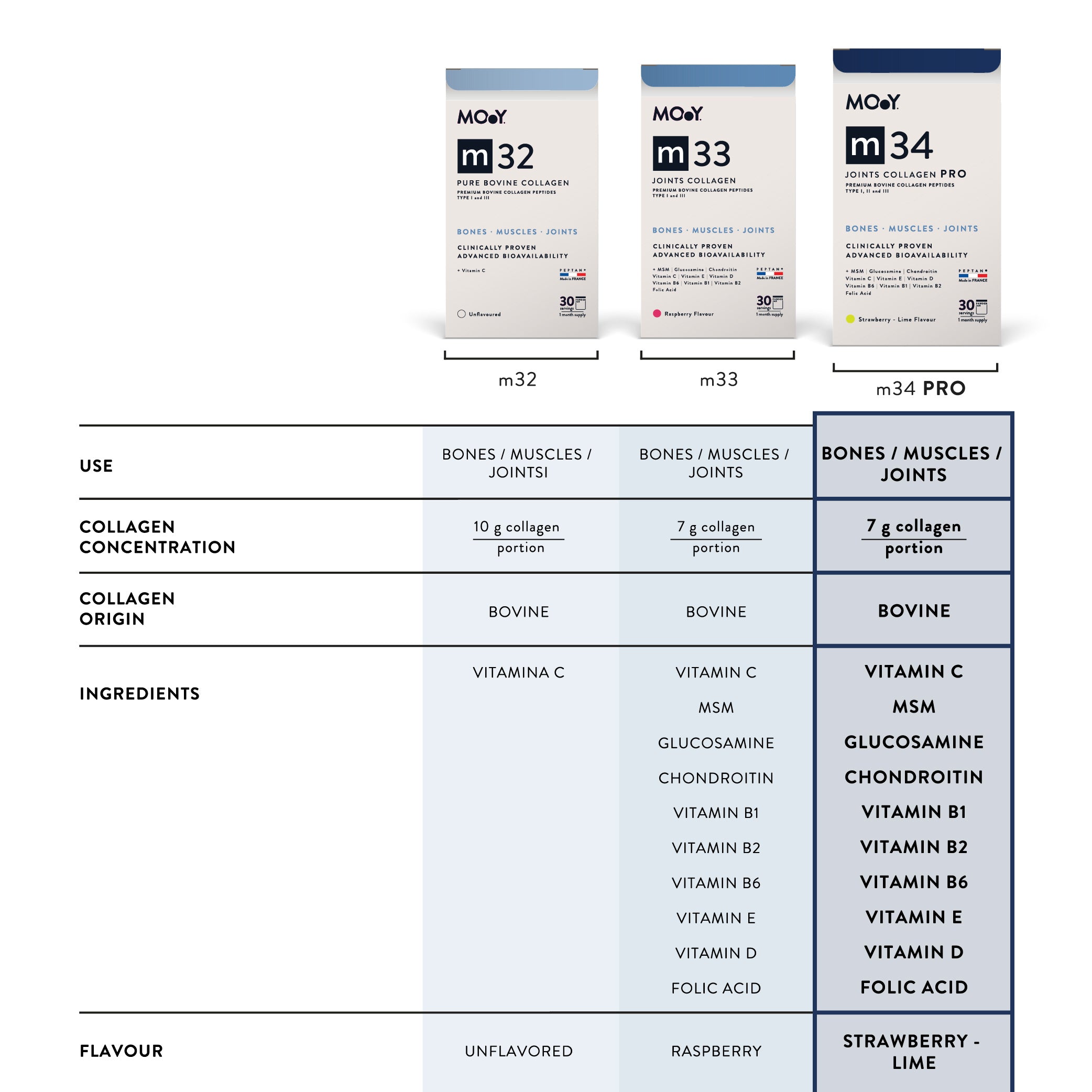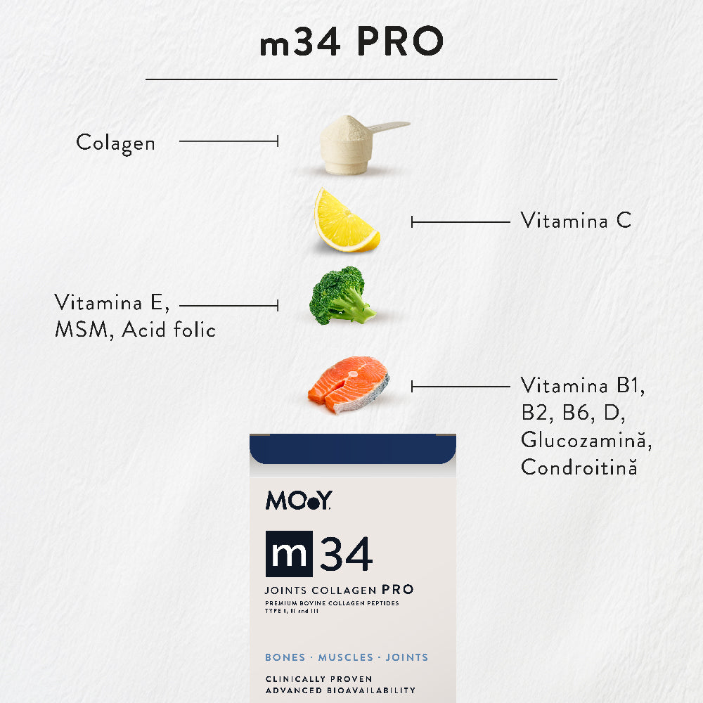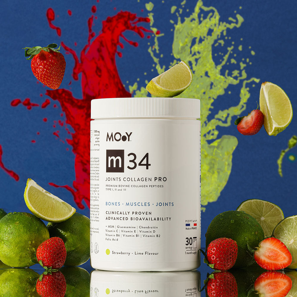 m34 JOINTS COLLAGEN PRO Strawberry Lime este o formula premium ce contine 7 g de peptide de colagen hidrolizat PEPTAN® produs in Franta per portie, de origine bovina, cu eficacitate dovedita clinic. Imbogatit cu extract din cartilaj de origine bovina, glucozamina, condroitina, MSM, acid malic, vitaminele C, E, D, B1, B2, B6 si B9, acest supliment sustine in mod natural functionarea optima a sistemului muscular, osos si articular.