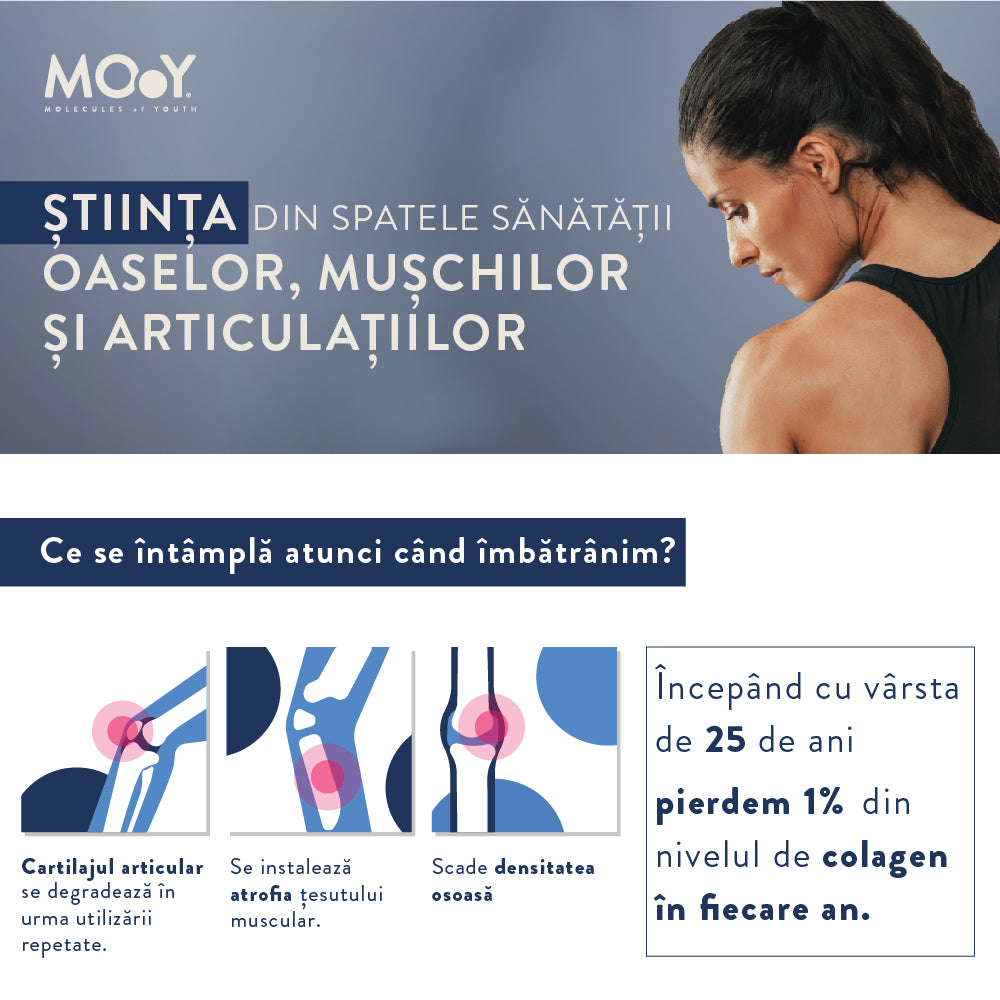 • Sustine sistemul osos: colagenul joaca un rol vital in mentinerea sanatatii oaselor, contribuind la densitatea lor si la prevenirea afectiunilor osoase, cum ar fi osteoporoza, pentru o structura corporala solida.