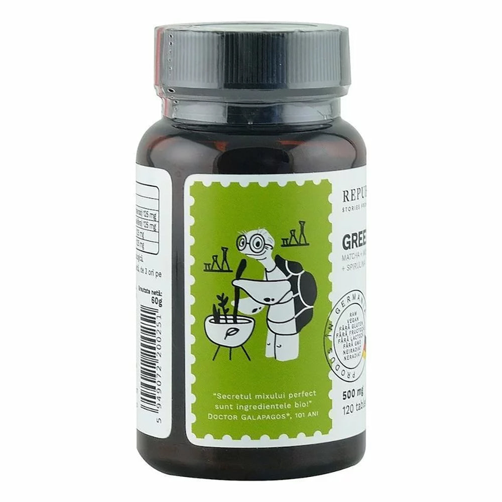 • Ingrediente/tableta: pulbere din frunze de Ceai-verde “Matcha”* (Camellia sinensis) – 125 mg; pulbere din frunze de Moringa* (Moringa oleifera) – 125 mg; pulbere de Chlorella* (Chlorella vulgaris) – 125 mg; pulbere de Spirulina* (Spirulina platensis) – 125 mg; (*ingrediente din agricultura ecologica).