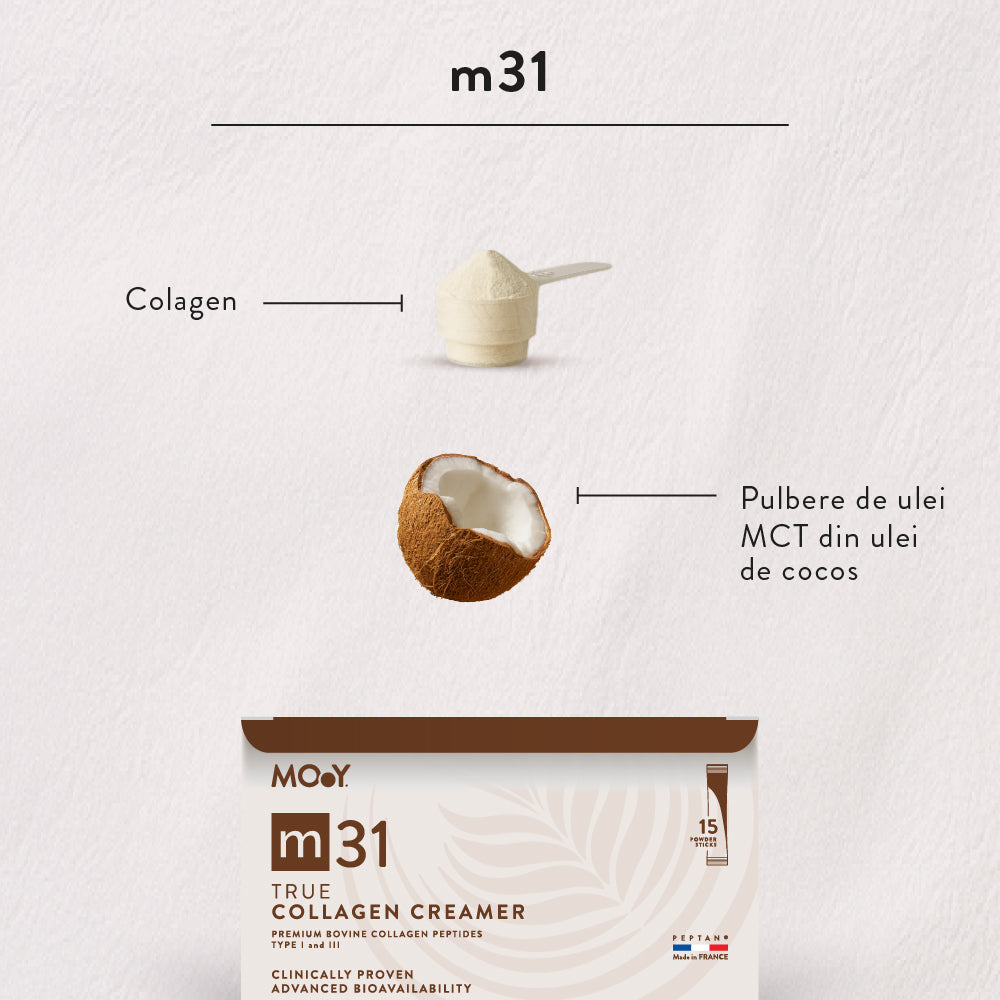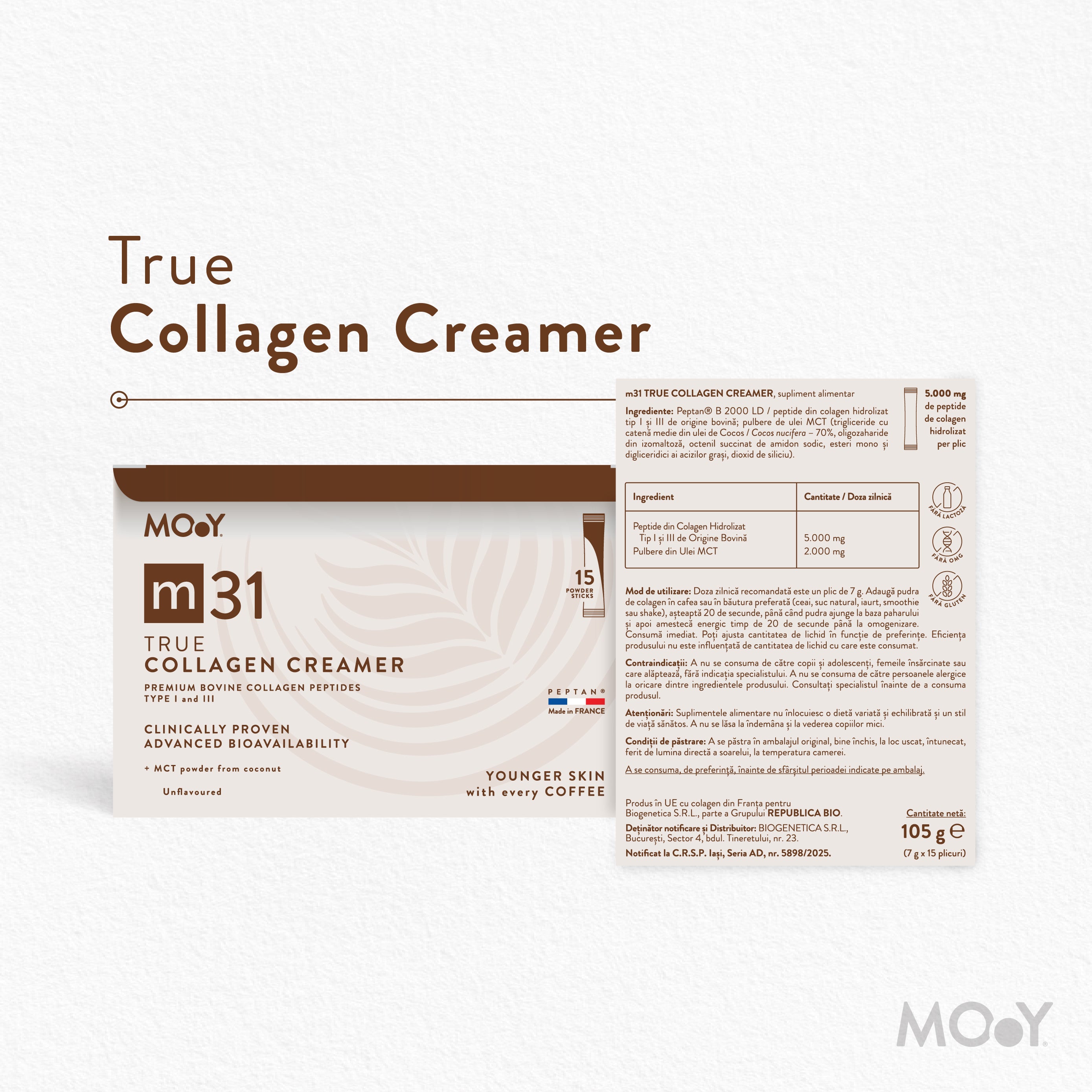 M31 TRUE COLLAGEN CREAMER este alegerea ideala pentru cei care isi doresc sa-si construiasca obiceiul de a sustine sanatatea pielii, parului si unghiilor, integrand consumul de colagen in rutina lor zilnica. Fiecare plic contine 5 g de peptide de colagen hidrolizat PEPTAN® de origine bovina, dezvoltate in Franta, cu eficienta dovedita clinic.